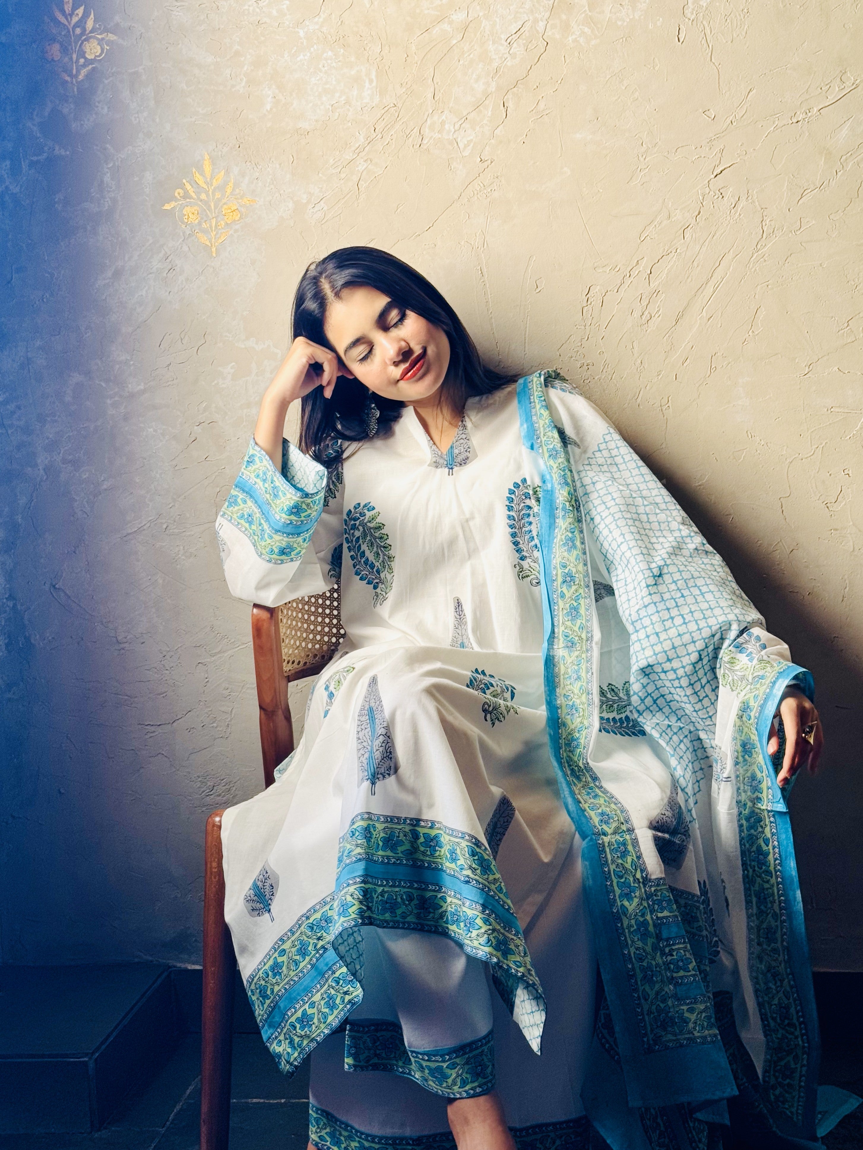 A timeless handblock printed suit crafted on soft cotton, Kashraf carries the charm of heritage with a touch of minimal elegance. The serene ivory base adorned with indigo motifs tells a story of tradition reimagined for the modern muse. Light, breathable, and effortlessly graceful — this piece is perfect for both quiet mornings and long festive evenings.