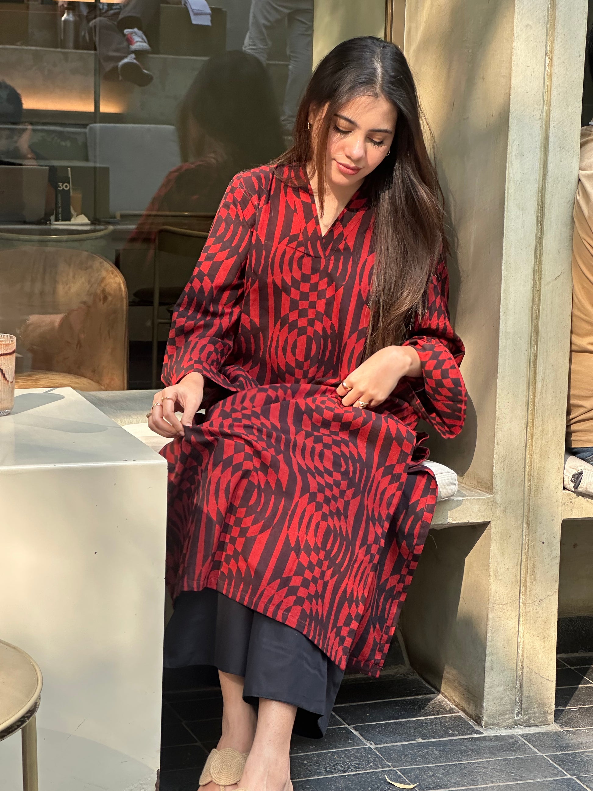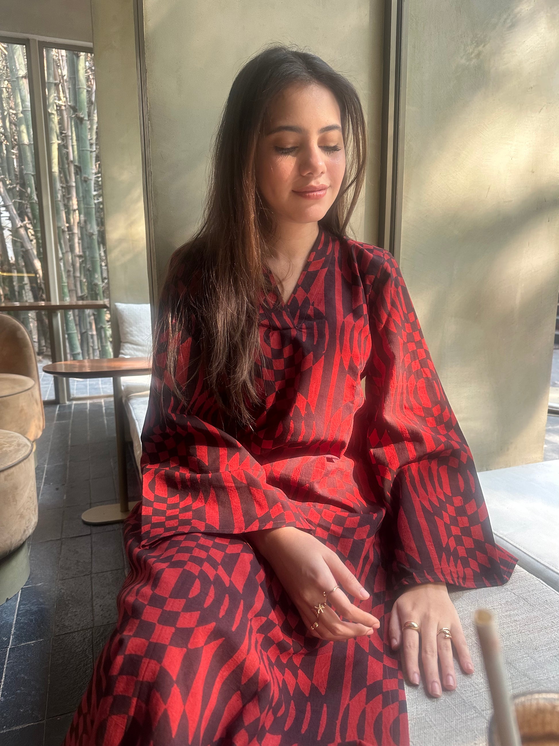 Crafted in 100% breathable cotton, this kurta features handblock-printed Ajrak-inspired geometric motifs, brought to life in a rich crimson hue. The fluid silhouette, soft flare sleeves, and effortless fall make it equal parts striking and wearable.